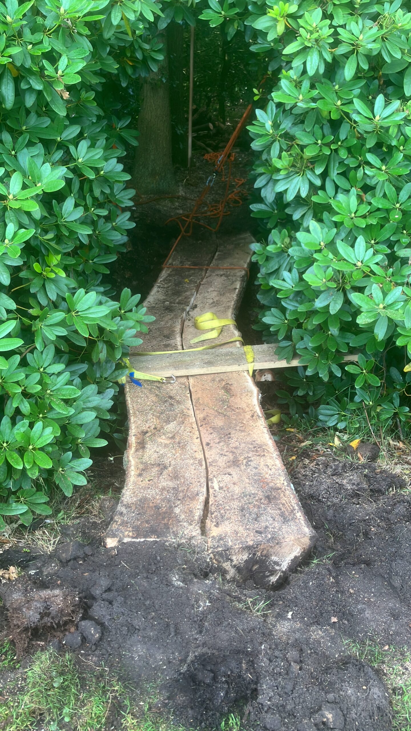 De oude brug over de sloot was verrot en moest vervangen worden. In plaats van een standaard oplossing kozen we voor een natuurlijke en duurzame aanpak.
