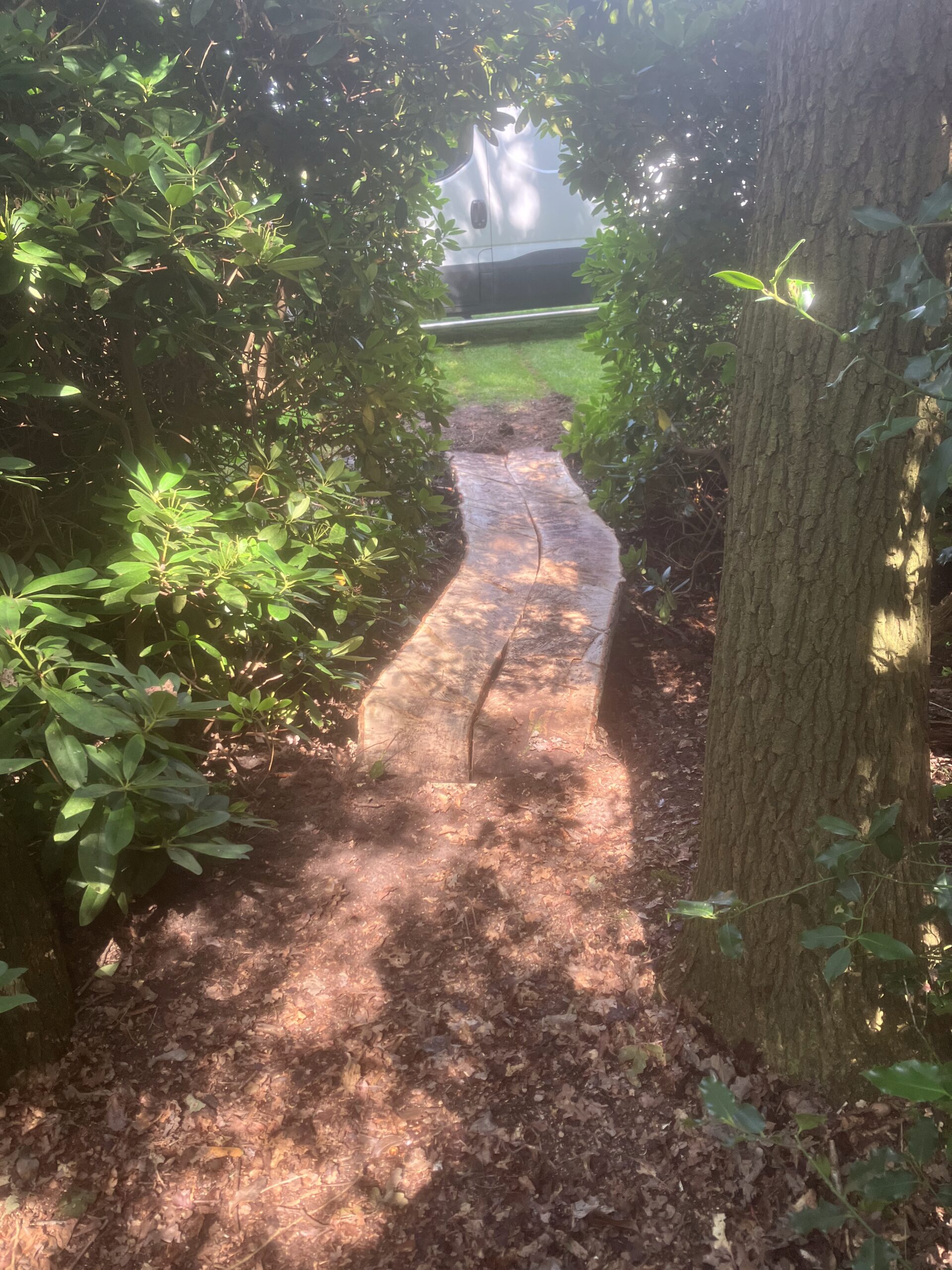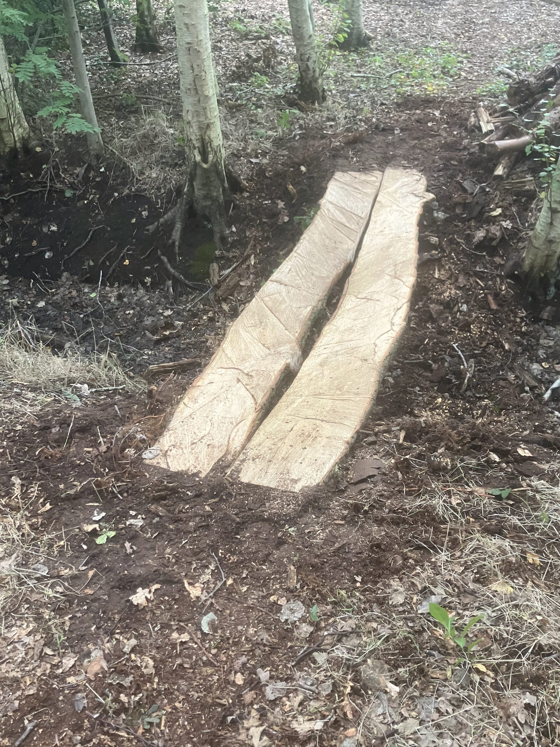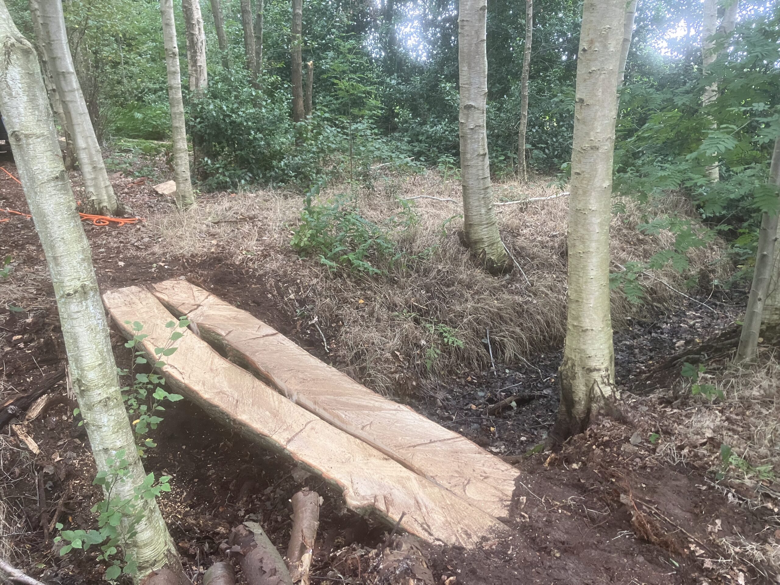 Door een boomstam in de lengte door te zagen en de twee helften naast elkaar over de sloot te plaatsen, zijn er twee stevige en karaktervolle bruggen gerealiseerd. Deze methode zorgt niet alleen voor een robuuste en milieuvriendelijke oplossing, maar behoudt ook de natuurlijke uitstraling van de omgeving.